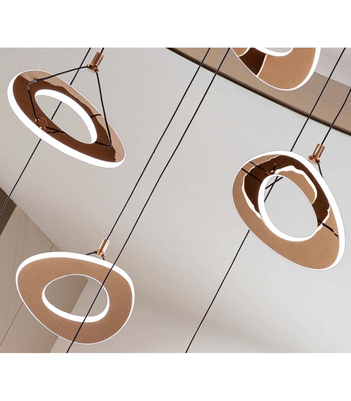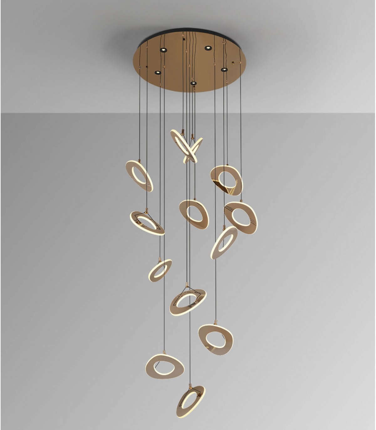 Lampe à 13 lumières et 5 spots zénithaux. Fabriquée en acier avec finition rose doré brillant. Diffuseur en acrylique opale. Réglable en hauteur.
